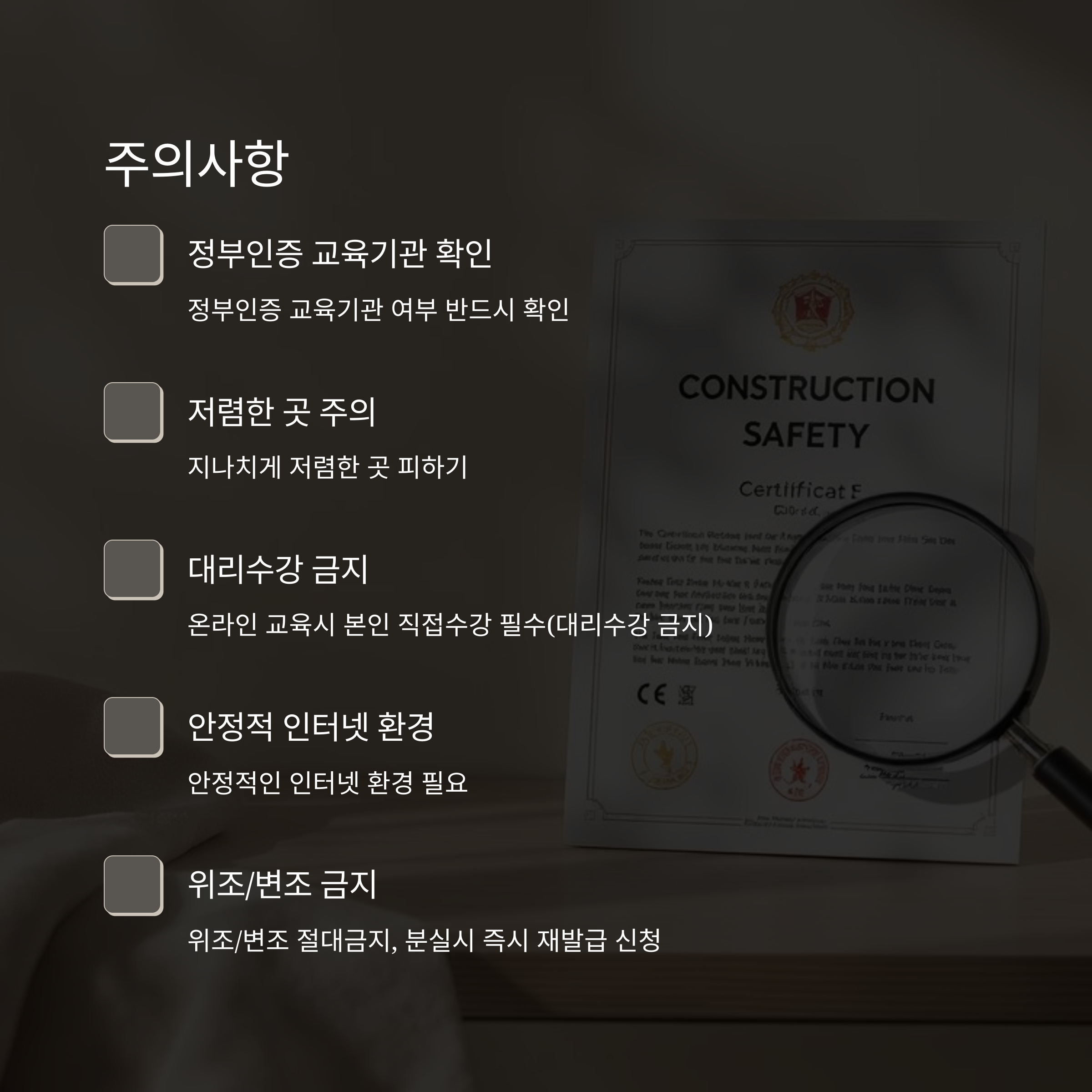 - 본인이 직접 수강해야 함 (대리 수강 금지)