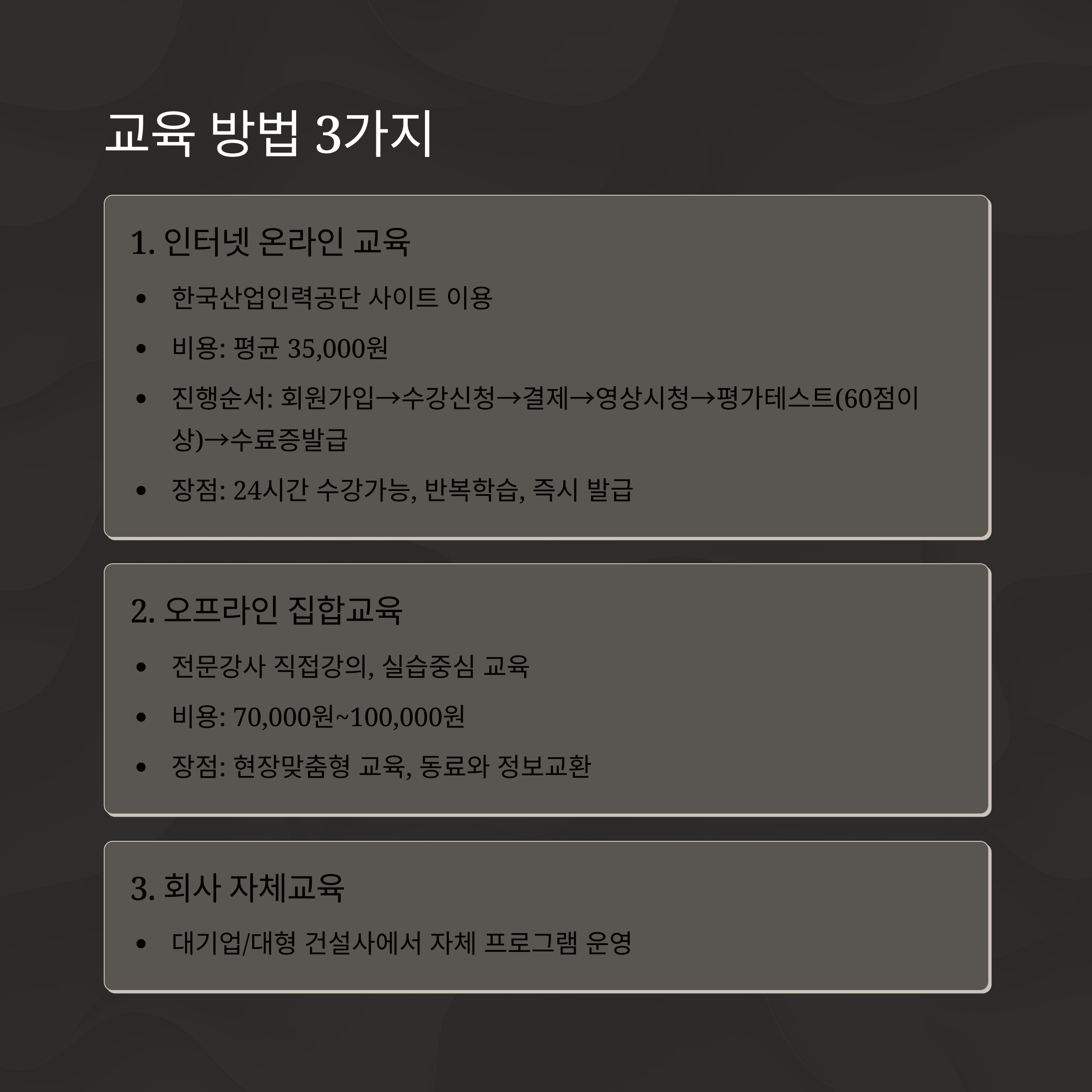 대기업이나 대형 건설사에서는 자체적으로 교육 프로그램을 운영하기도 합니다.