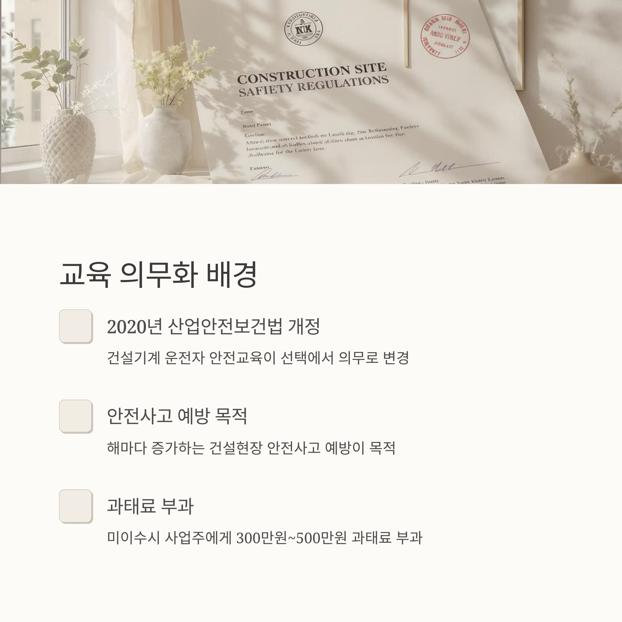 교육을 받지 않을 경우 사업주에게 300만원에서 500만원까지의 과태료가 부과됩니다. 한 건설업체는 작년에 안전교육 미이수로 인해 실제로 고액의 과태료를 납부한 사례도 있었습니다.