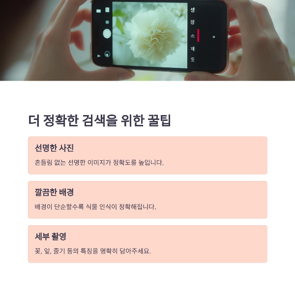 | 여러 각도에서 시도하기 | 한 번에 결과가 만족스럽지 않다면, 다른 각도나 다른 부위(꽃, 잎, 전체)를 촬영해보세요. |