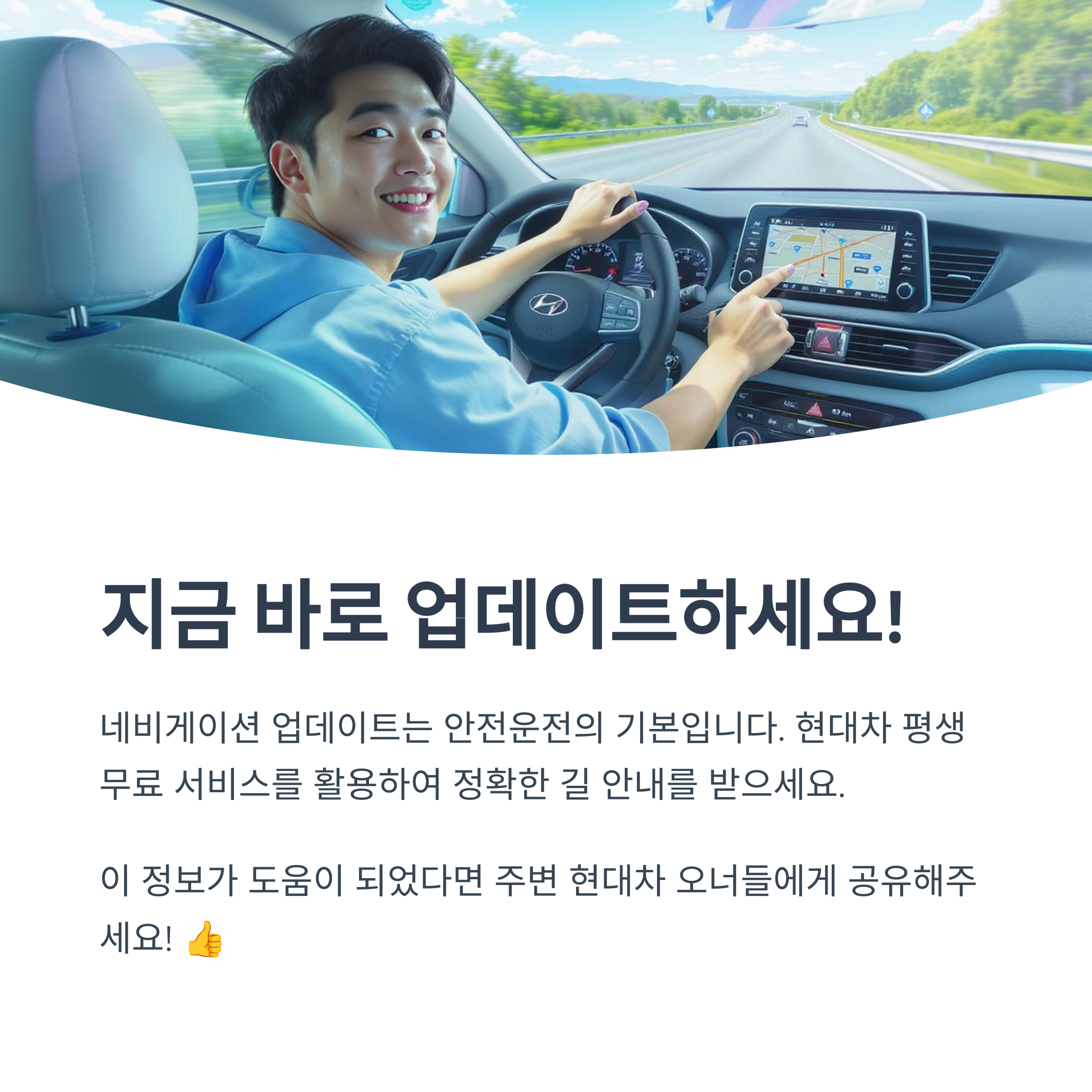 "업데이트 비용이 있나요?" - 현대자동차 순정 네비게이션은 평생 무료 업데이트를 제공합니다.