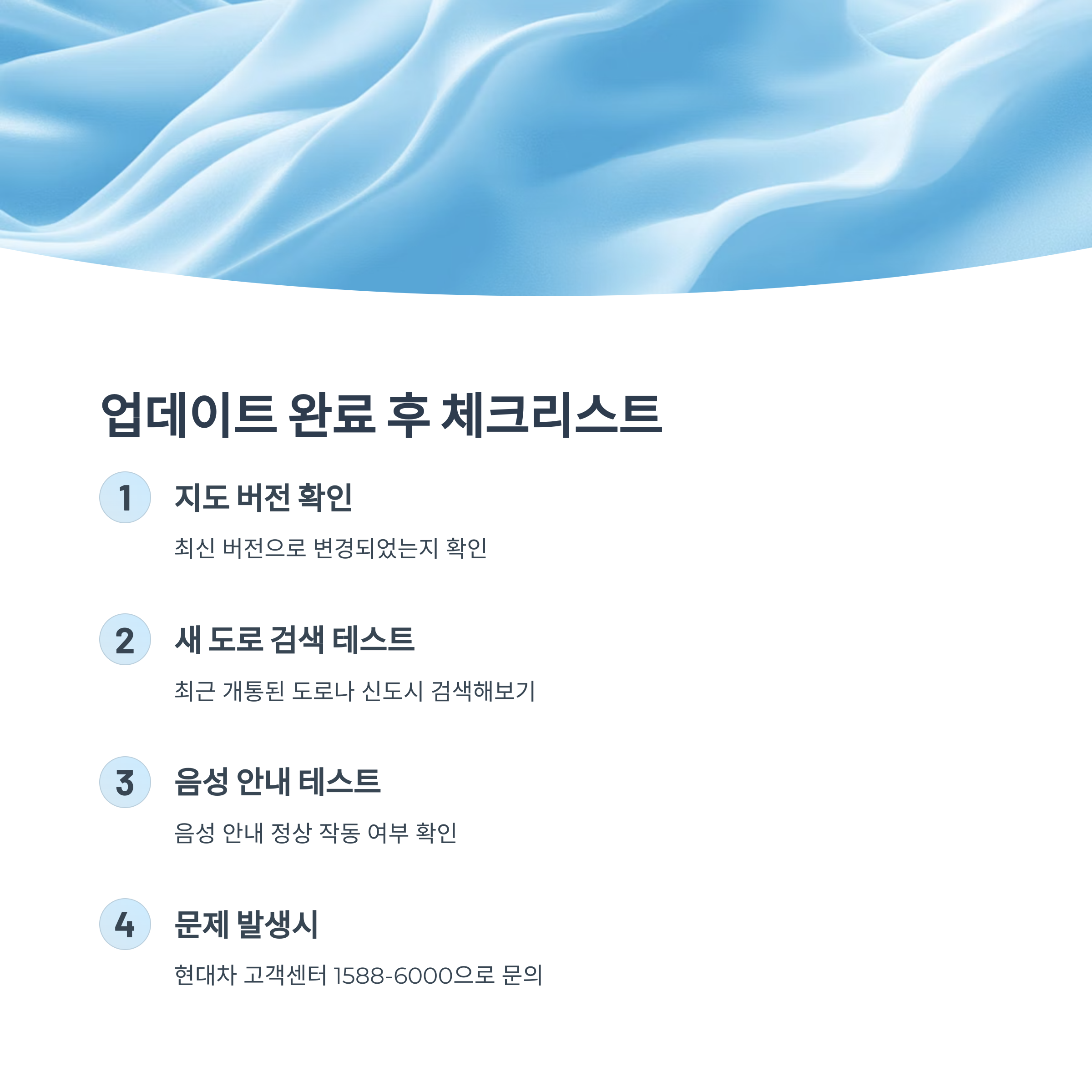 음성 안내가 정상적으로 작동하는지, 경로 계산이 빠르게 이루어지는지도 확인해야 합니다. 만약 업데이트 후 문제가 발생한다면 현대자동차 고객센터(1588-6000)에 문의하시기 바랍니다.