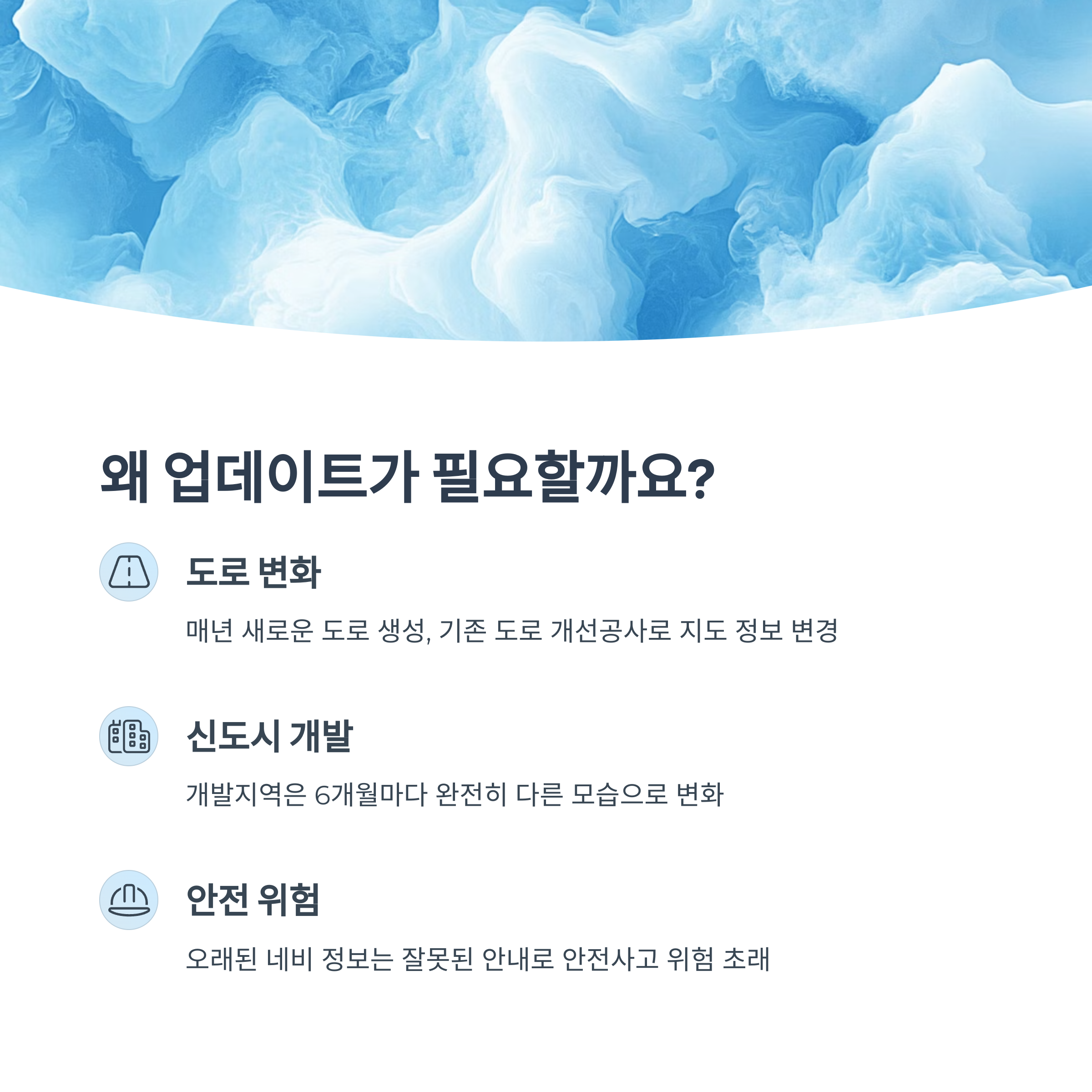 도로는 매년 새로 만들어지고, 기존 도로도 개선공사로 인해 차선이 바뀌거나 교차로가 개편됩니다. 특히 신도시나 개발지역의 경우 6개월만 지나도 완전히 다른 모습으로 변하는 경우가 많죠. 이런 변화를 반영하지 못한 네비게이션은 운전자에게 잘못된 정보를 제공하게 되고, 이는 곧 안전사고로 이어질 수 있습니다.