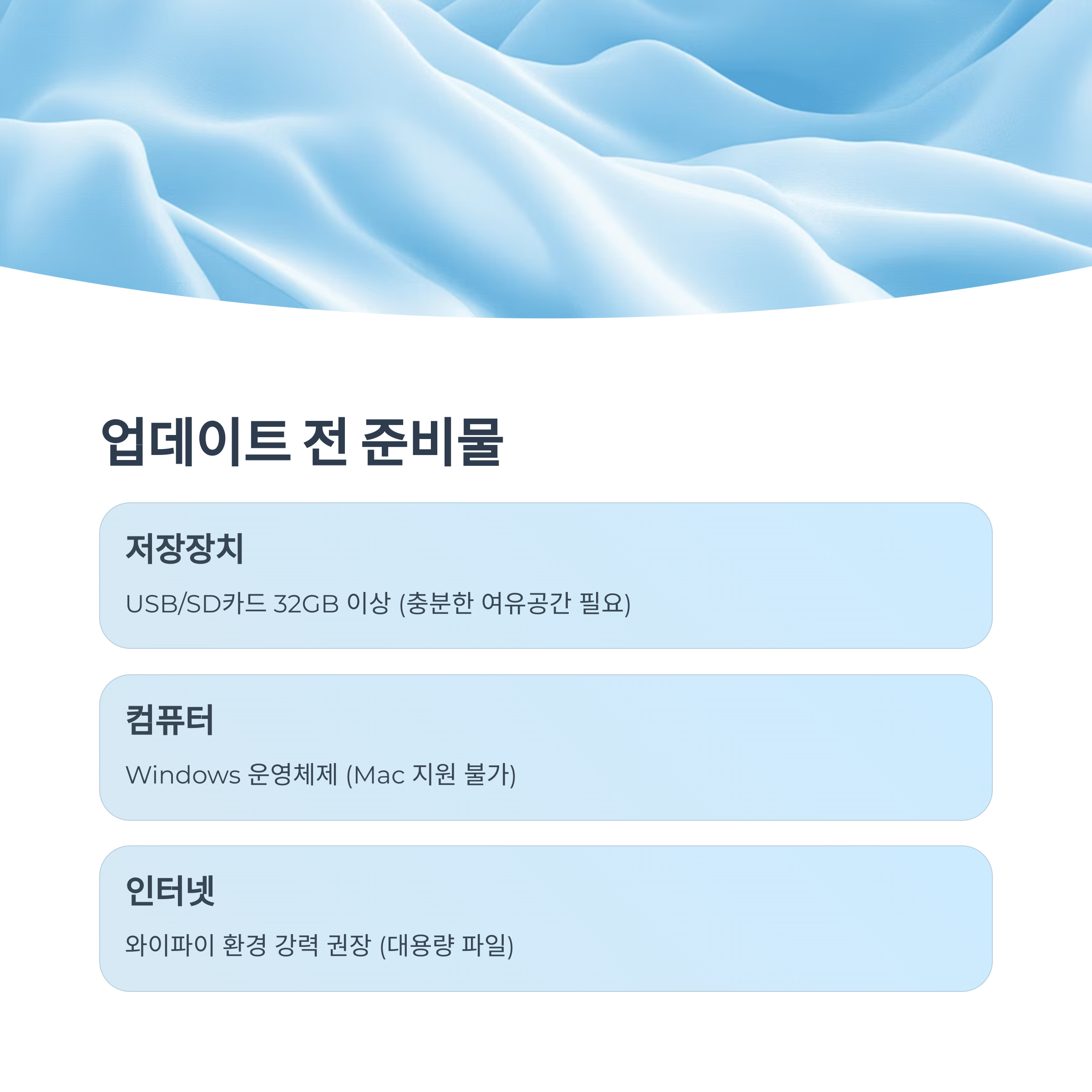 다음으로는 Windows 운영체제가 설치된 컴퓨터가 필요합니다. 아쉽게도 Mac은 지원하지 않으므로, Mac 사용자라면 주변에 Windows PC를 빌려야 합니다. 또한 안정적인 인터넷 연결이 필수적입니다. 업데이트 파일이 용량이 크기 때문에 와이파이 환경에서 진행하시는 것을 강력히 권장합니다.